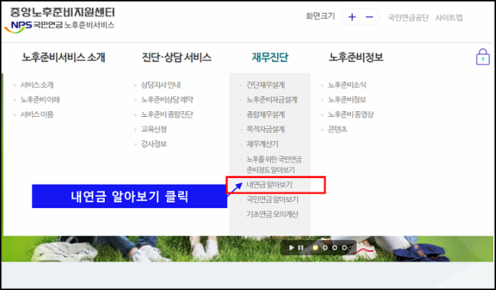 - 개인 서비스 > 신고/신청 > 연금/일시금 청구 메뉴를 선택합니다.
